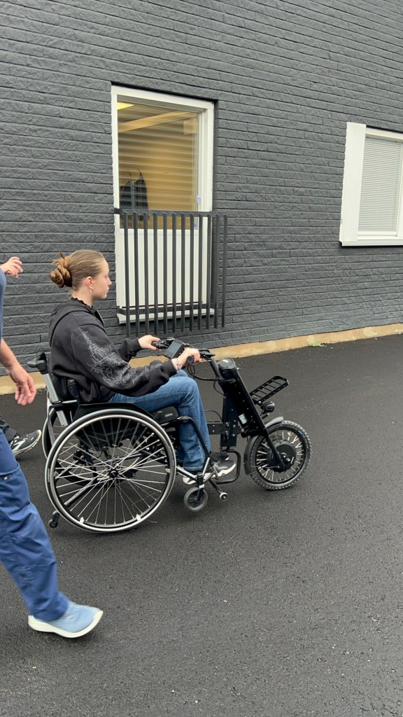 Trots att det här ”styret” fanns så började vi mötet med att prova smart drive, vilket är ett mindre batteri som fästs baktill på rullstolen. Man kan i princip inte styra och sätter av och på farten genom att trycka på en knapp på rätt sätt. Då jag aldrig kört manuell rullstol själv hade jag redan svårt med styrningen, och att då lägga på fart gjorde det hela betydligt värre. Jag körde in i väggar, möbler och var på väg att köra rätt ut på vägen (se video nedan). Som tur var verkade även smart driven känna på dig att vi inte riktigt passade tillsammans och la av i uppförsbacken. Jag blev så trött av att försöka hålla koll på både rullstol och smart drive att jag fick ta en vilopaus innan vi gick vidare direkt till drivaggregatet med hjul (cykelstyret).