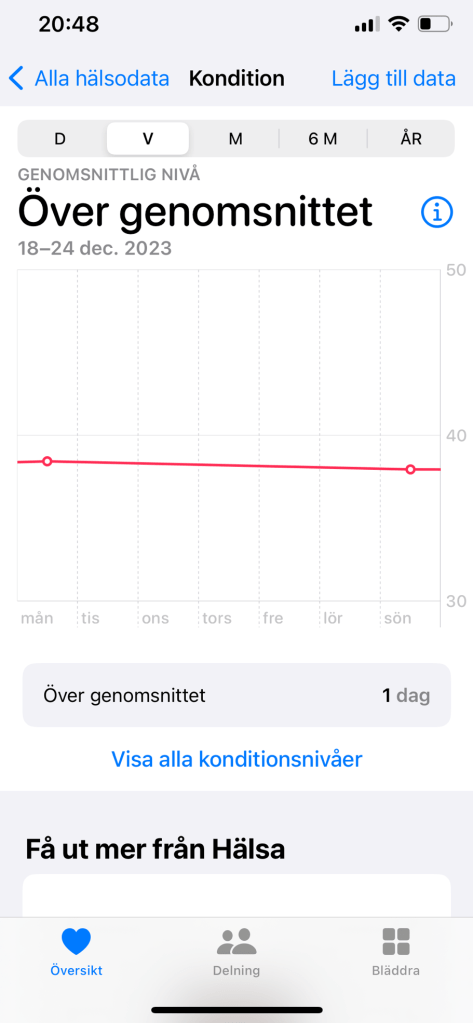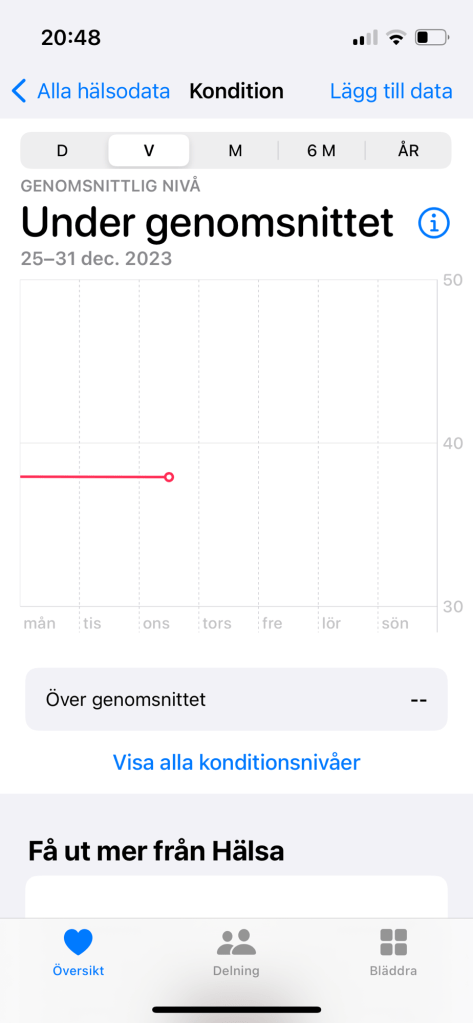 Utöver det så förlorade jag såklart även förmågor, däribland min kondition. Apple Watch räknar ut ens kondition över tid, vilket visas på en graf. Under de tre år som jag haft min klocka hade min kondition konstant legat på över genomsnittet, även under de perioder jag tagit en paus från träningen. Natten till den 25:e december 2023 går grafen plötsligt drastiskt nedåt, och min kondition blir under genomsnittet. Där har den stannat, vilket är både intressant och validerande, eftersom att jag vet exakt det datum som jag blev sjuk (se bilder nedan).