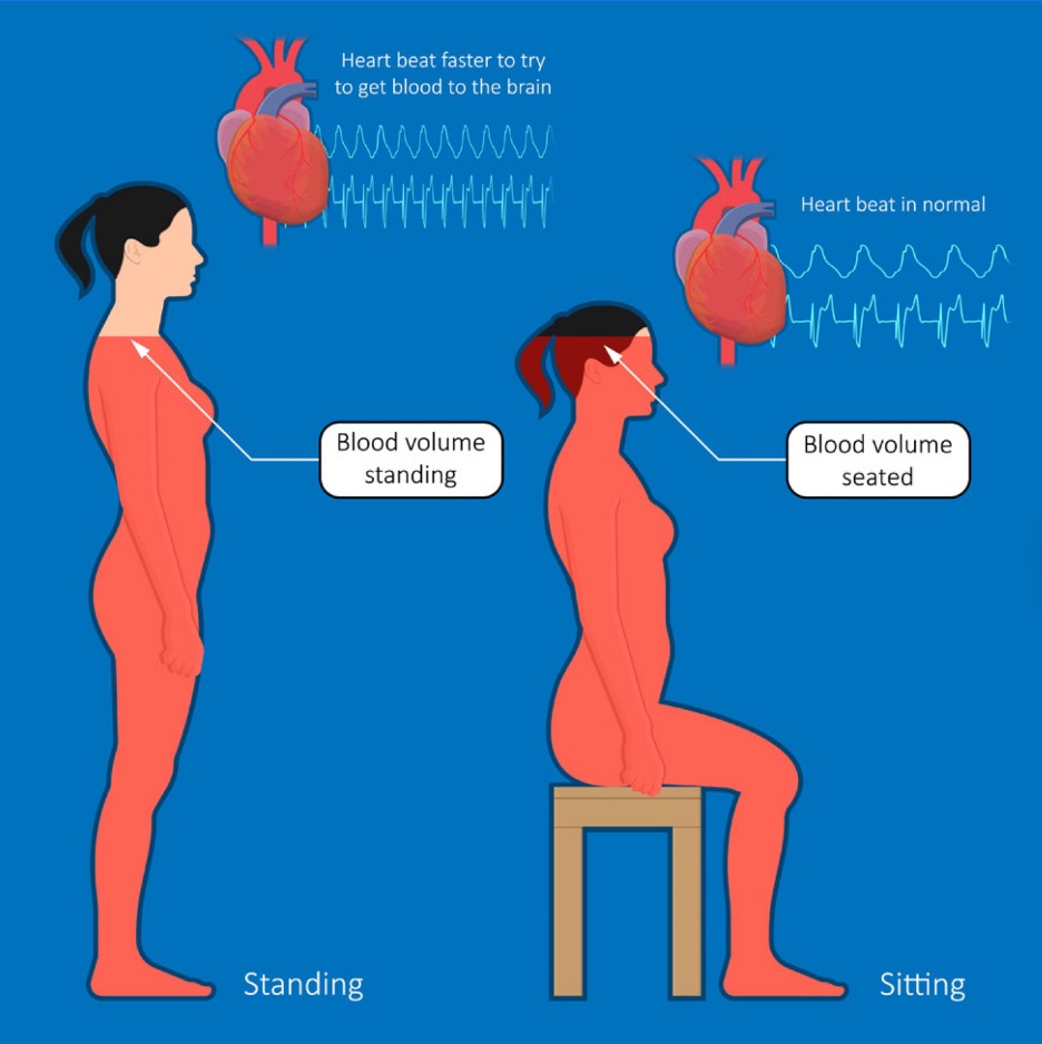 Vid POTS förekommer en så kallad ortostatisk intolerans, vilket innebär att kroppens cirkulation inte kan anpassa sig till upprätt ställning (Gilvad, 2021). Jämfört med friska individer tillförs det vid ortostatisk intolerans en betydligt lägre volym blod tillbaka till hjärtat under uppresning (National Institutes of Neurological Disorders and Stroke, u.å). Detta resulterar i ett minskat blodflöde till hjärnan, vilket uttrycker sig genom symtom såsom yrsel, blodtrycksfall och förvärrade symtom vid upprätt position.