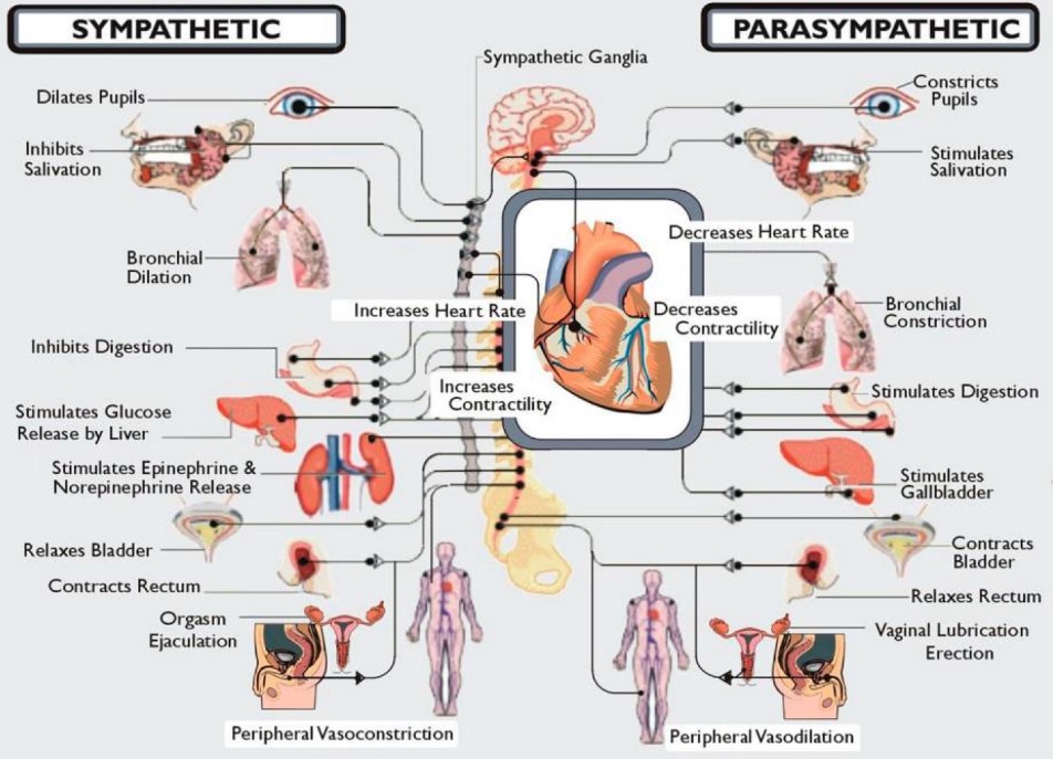 Det autonoma nervsystemet (ANS) reglerar all de kroppsliga funktioner vi inte kan styra över, såsom andning, puls, blodtryck, matsmältning, njurarna, urinblåsan, ögonen och kroppstemperaturen (Dysautonomia International What is dysautonomia? u.å). Förenklat kan det autonoma nervsystemet delas upp i tre delar: det parasympatiska nervsystemet, det sympatiska nervsystemet och det enteriska nervsystemet (Tuominen 2024). Det enteriska nervsystemet reglerar mag- och tarmkanalen, medan de övriga två delarna agerar som varandras motsatser. Det sympatiska nervsystemet kallas ofta för “fight or flight” eller “kamp eller flykt” och aktiveras vid exempelvis stress eller rädsla. Detta nervsystem gör bland annat att stresshormonerna noradrenalin och adrenalin frigörs, vilket resulterar i att pupillerna drar ihop sig, pulsen ökar, matsmältningen stannar av, ökad svettning och att mindre saliv utsöndras. Det parasympatiska nervsystemet är mest aktivt i lugna situationer då kroppen byggs upp och återhämtar sig, och resulterar bland annat i att pulsen minskar, matsmältningen stimuleras, pupillerna vidgas och att salivproduktionen ökar (Tuominen 2024). En vanlig missuppfattning är att patienter med POTS endast upplever symtom vid uppresning. Då det autonoma nervsystemet reglerar kroppens alla funktioner resulterar en rubbning av detta symtom i symtom från hela kroppen, vilka förekommer oavsett läge. Även om fåtal av symtomen, såsom yrsel, takykardi, pre syncope/syncope och blodtrycksfall triggas igång av uppresning, så förekommer de övriga symtomen konstant, oberoende av lägesförändring (Dysautonomia International Postural Orthostatic Tachycardia Syndrome u.å). Symtomen kan även förvärras till följd av orsaker såsom infektion, stress, motion, långvarigt stående, vätskebrist och värme (John Hopkins u.å).