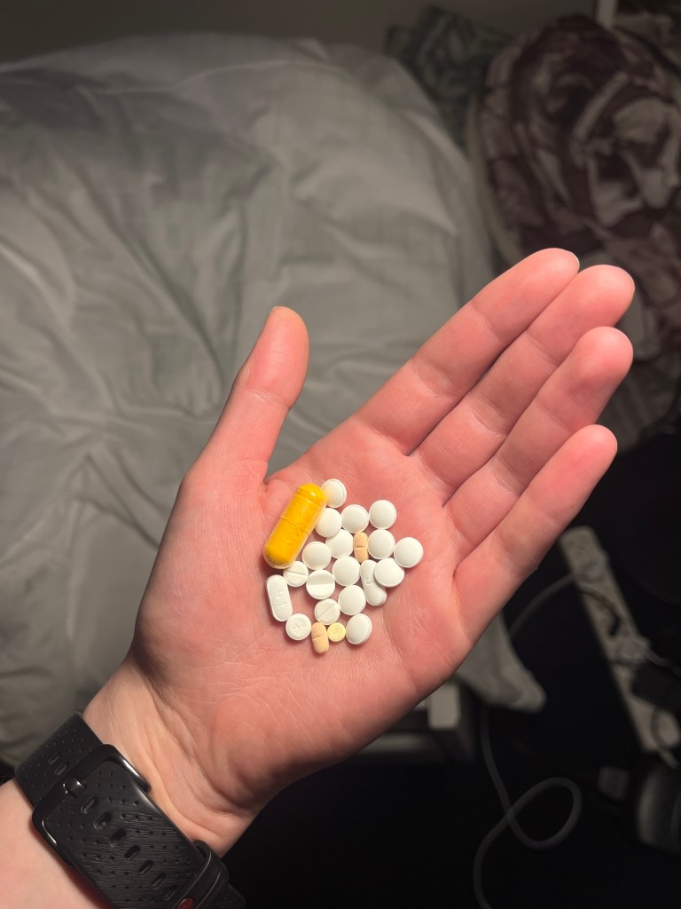 Det bästa är alltid att försöka få i sig så mycket som möjligt genom kosten, men då jag sover så mycket och dessutom mår illa dagligen tar jag en mängd tillskott för att säkerställa att jag verkligen får i mig alla näringsämnen. Jag har även fått Q10 och B12-injektioner utskrivna av en läkare. Då jag tidigare haft besvär med Willis Ekboms sjukdom eller Restless Legs Syndrom (RLS) ska mitt ferritin alltid ligga över 100, men rekommendationen jag har hört för POTS är ferritin över 50. Under de senaste tre åren har jag behövt intravenöst järn en gång om året, vilket även hjälpt med en del andra symtom såsom trötthet och andfåddhet. Då mina B12-injektioner ännu är ett så pass nytt tillägg vet jag ännu inte om de haft någon effekt, och kommer därför att fokusera på de andra tillskotten som jag tar.