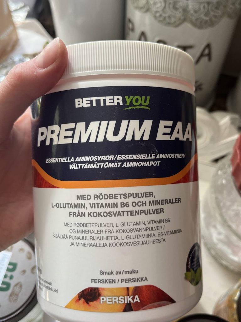 Essentiella aminosyror: Sedan jag började hos min tränare har jag börjat ta essentiella aminosyror i pulverform (pre workout) av märket EAA, vilka jag tar på morgonen och innan träning. Syftet med aminosyror som tillskott är att det ska hjälpa mig att bygga muskler, vilket är ett av målen för min träning.