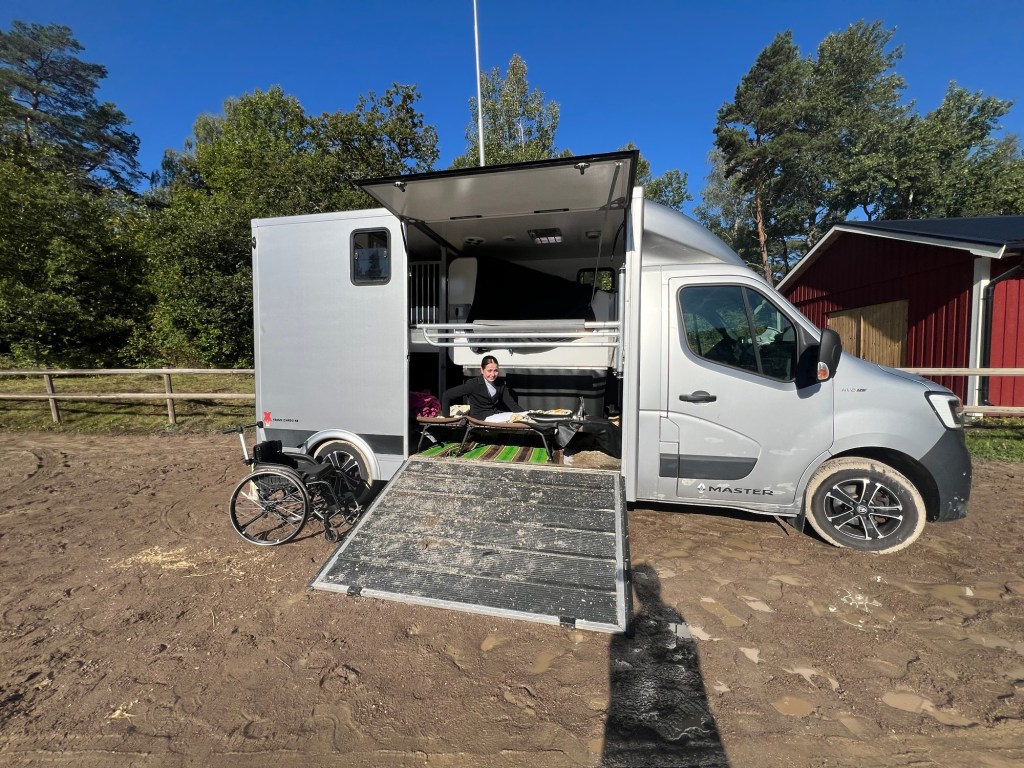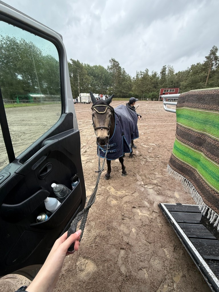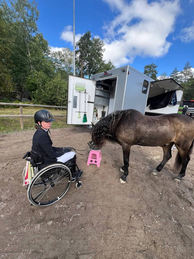 Själva tävlingsdagen började extremt tidigt, där jag hade ställt mitt alarm på 04:00 för att hinna med min invecklade morgonrutin för min POTS (mediciner, tillskott, pneumatisk kompression med mera). Därefter bar det av till Uppsala ponnyklubb, där jag lyckades rulla den extremt blöta banan med min elsparkcykel. Det var lugnt sagt en annorlunda tävlingsdag, där packningen bland annat bestod av min rullstol och en utfällbar säng för mig att vila på (se bild nedan). Eftersom min POTS blir värre av att jag befinner mig i en upprätt position tog vi med sängen så att jag kunde vila både innan och under tävlingen, vilket hjälpte mig att ta mig igenom hela tävlingsdagen. Utöver det hade jag med mig mediciner och elektrolyter, och såg till att vila så fort jag fick chansen. Som tur var hade jag en riktigt bra dag symptommässigt, och det var först efter prisutdelningen som jag började må riktigt dåligt.