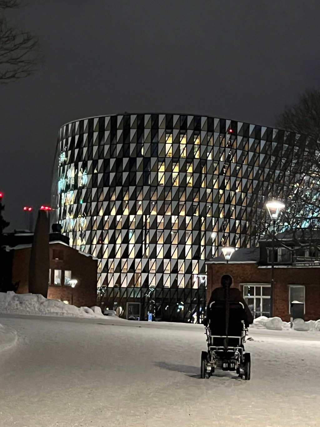 För några veckor sedan trotsade mamma och jag snön och begav oss till Karolinska Institutet för att provköra sträckan från bilen till föreläsningssalen med elrullstolen. Det var verkligen imponerande hur bra den klarar av att ta sig fram, trots isiga gator, snö och branta backar. Plogningen på gatorna (framförallt vid övergångsställena) var i många fall icke existerande, men trots det tog vi oss hela vägen till föreläsningssalen, även om mamma ibland fick hjälpa till och putta då jag körde fast. Karolinskas campus visade sig vara fullt av backar som jag definitivt inte hade klarat med min manuella rullstol, där en del var så pass branta att inte ens drivaggregatet hade klarat av dem, men elrullstolen bara körde på som om det inte vore någonting, trots att marken var såväl isig som full av snö (det var heller inte sandat på gatorna).