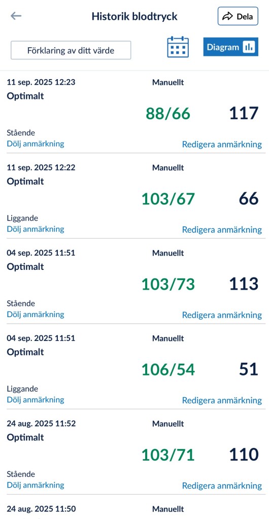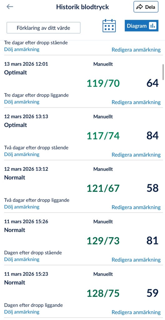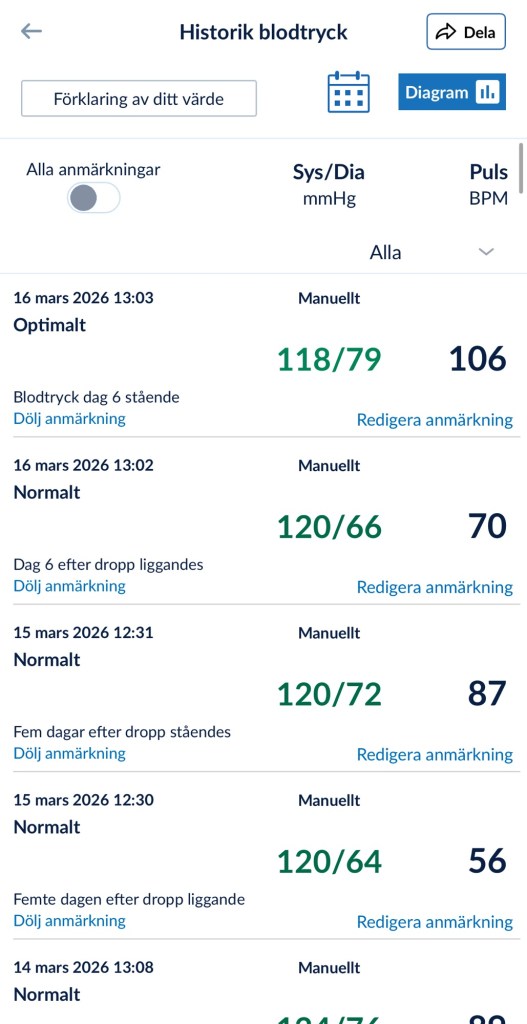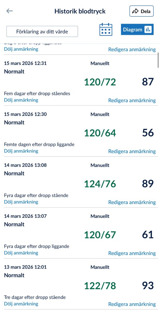 Som jag skrev i mitt föregående inlägg får jag för närvarande två liter dropp innehållande Ringer Acetat en gång i veckan under sex veckors tid, vartefter vi ska utvärdera om behandlingen haft någon effekt. Som ni kan se nedan har droppet bland annat hjälpt till att stabilisera både blodtryck och puls, där det höjt blodtrycket och sänkt pulsen. Normalt sett brukar jag ligga omkring eller under 100 systoliskt i stående, trots dubbel dos blodtrykshöjande medicin, med en pulsökning på över 40 slag (ofta över 50) när jag går från liggande till stående position. Dagarna efter droppet har jag haft det högsta blodtrycket jag haft sedan jag började få besvär med lågt blodtryck, där jag legat på 120 systoliskt, utan att det faller när jag reser mig upp. Min pulsökning har även varit betydligt lägre, där jag vid en del tillfällen inte ens nått upp till diagnoskriterierna för POTS (!).